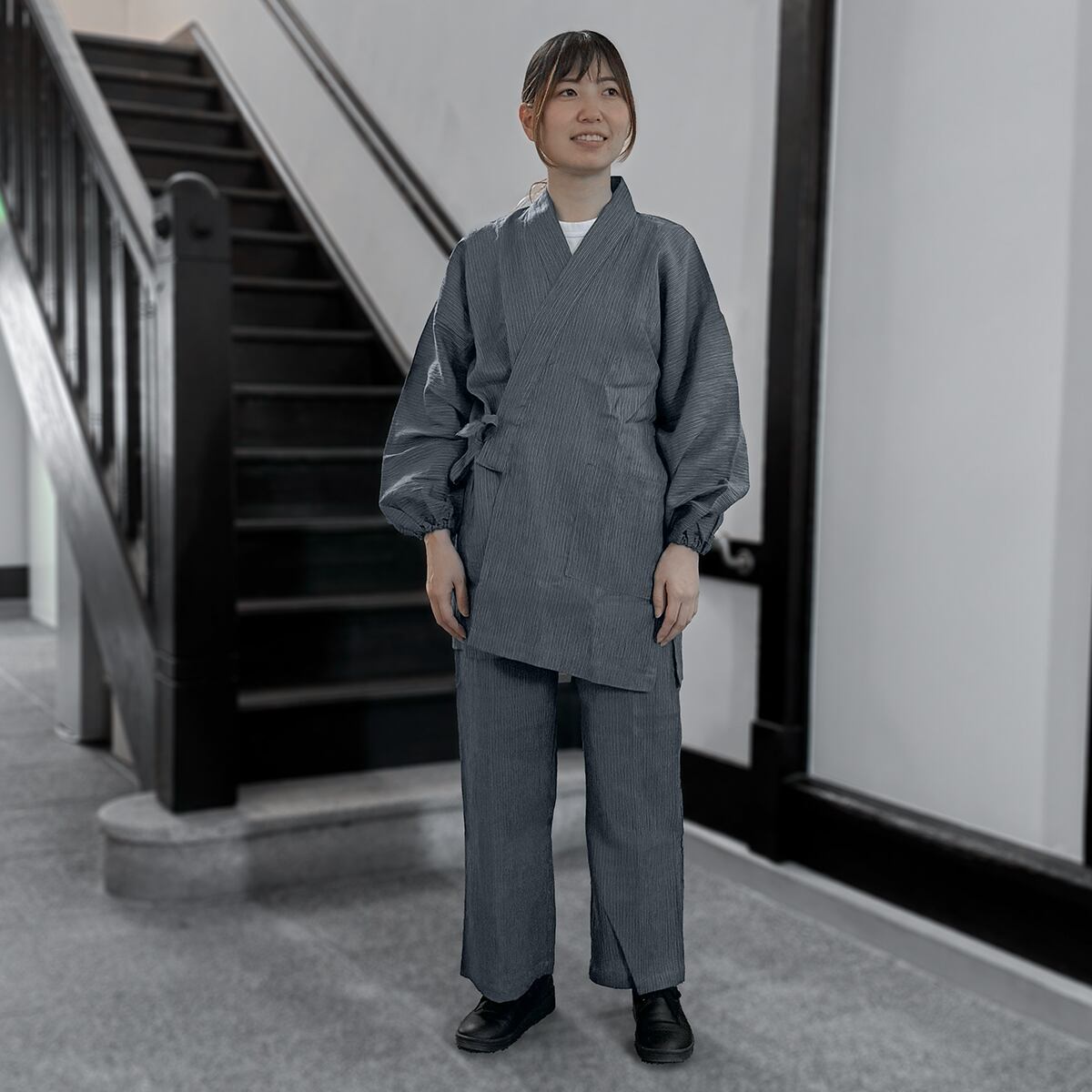 作務衣のパンツは、作務衣を着るときだけでなく、普段使いもできるよう敢えて裾をゴムにせず、ストレートタイプのパンツにしています。ストレートパンツも、普段着として色々な洋服と合わせて着られるカジュアルさがありつつ、作業の邪魔にならないよう、太すぎず細すぎず工夫し、動きやすさを目指しました。