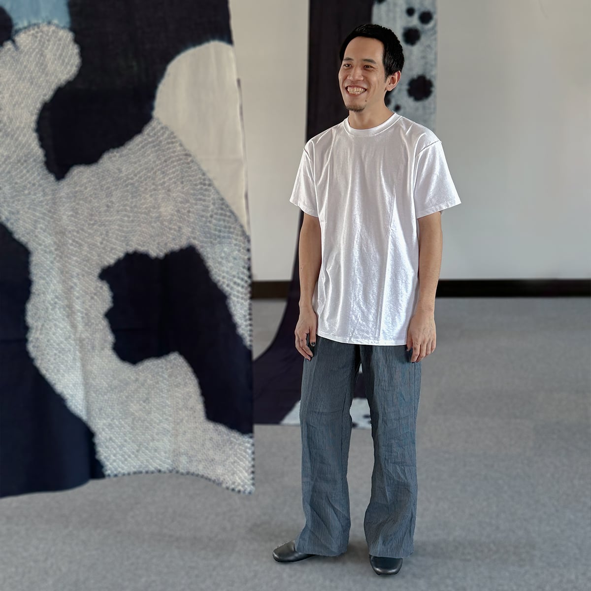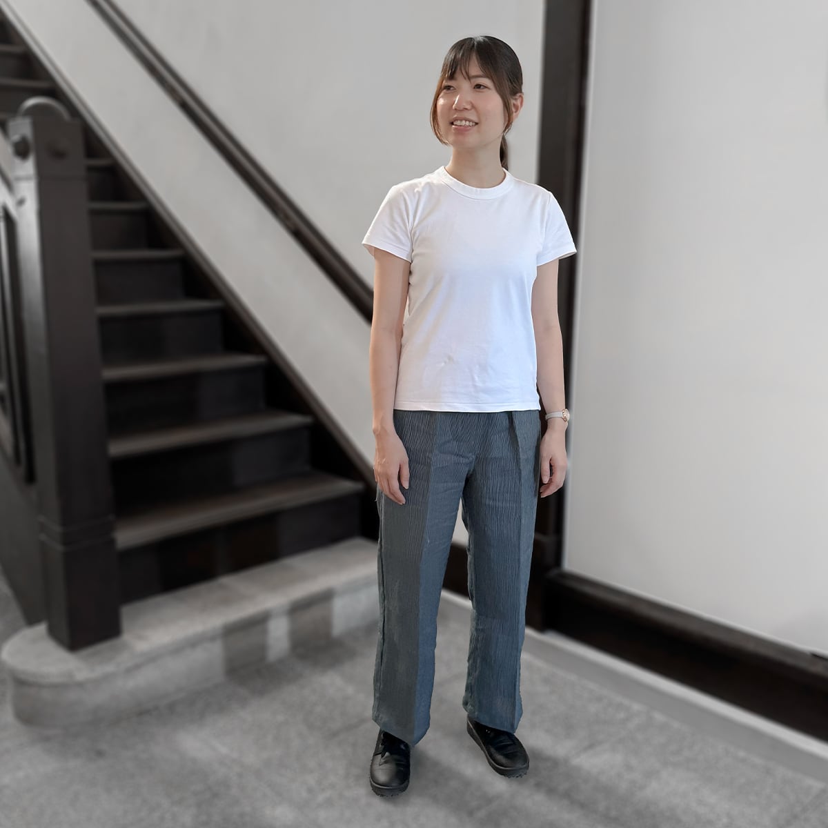 作務衣のパンツは、作務衣を着るときだけでなく、普段使いもできるよう敢えて裾をゴムにせず、ストレートタイプのパンツにしています。ストレートパンツも、普段着として色々な洋服と合わせて着られるカジュアルさがありつつ、作業の邪魔にならないよう、太すぎず細すぎず工夫し、動きやすさを目指しました。