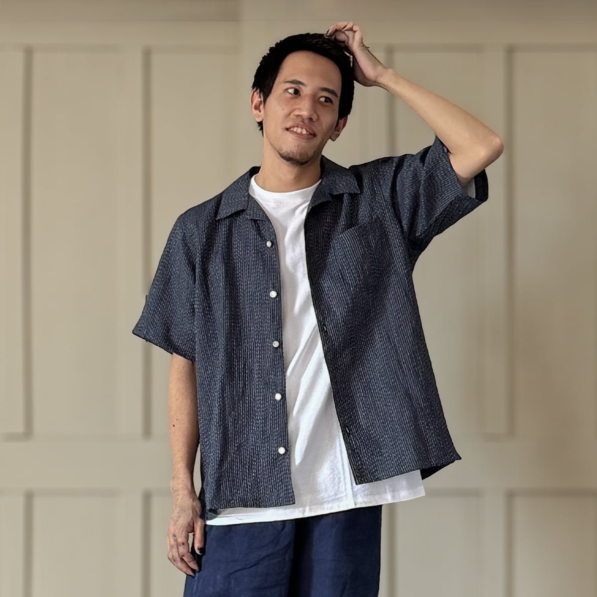 【メンズ】【ラミー100%】アロハシャツ 紺色絣縞