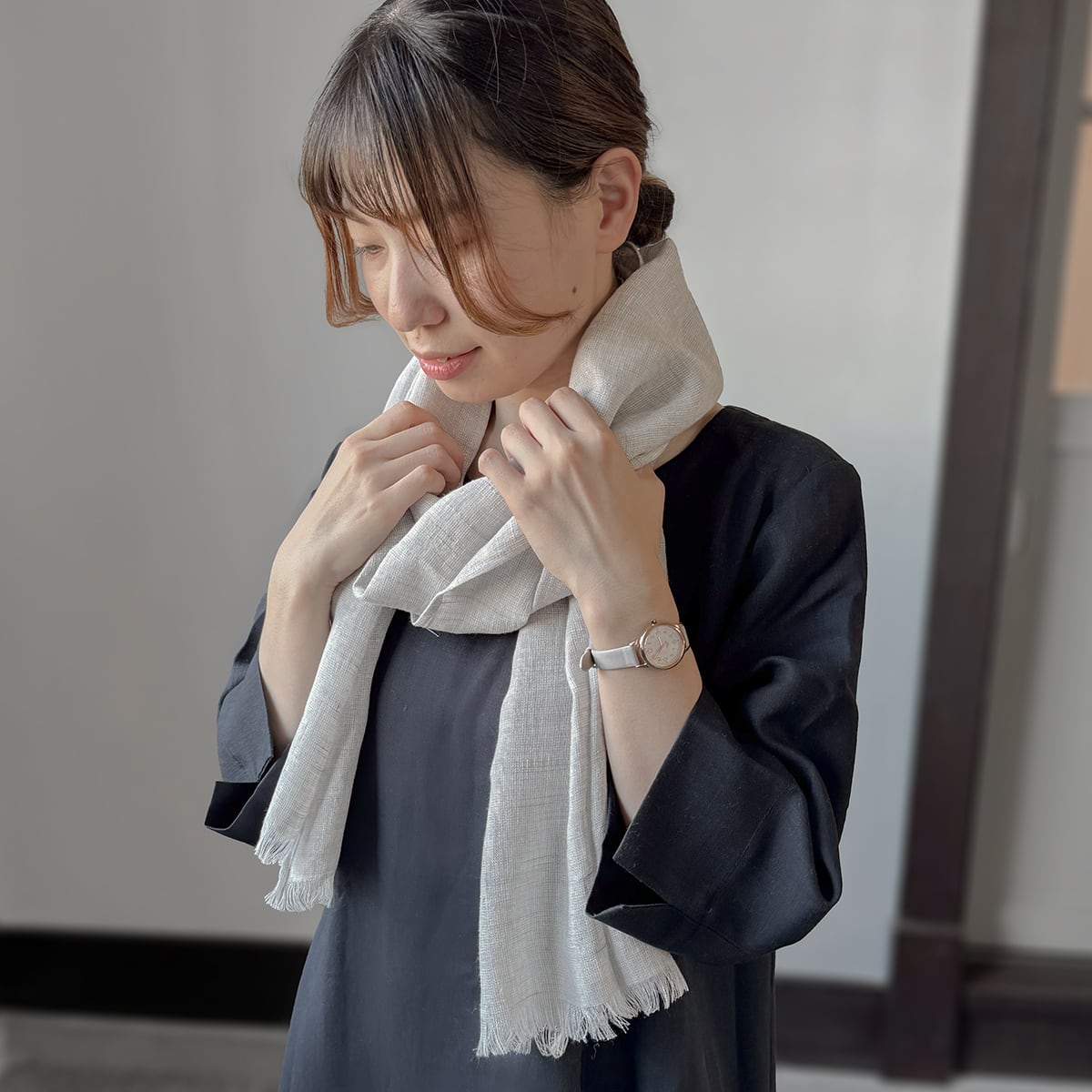近江上布伝統産業会館オリジナルブランド「Omi-Jofu」のリネンストール、新色です。リネンのストールは通気性・吸水性に優れ、肌に触れるたびに心地よさが広がります。洗うたびに風合いが増していきます。ガーゼのような透け感ではなく、厚みのあるリネン生地。肌寒くなる秋口にぴったり(秋ストール)、そして待ち遠しい春先にも使えます。一枚でふたつの季節を楽しむ。秋にも春にも、ちょうどいいリネンストールです。
